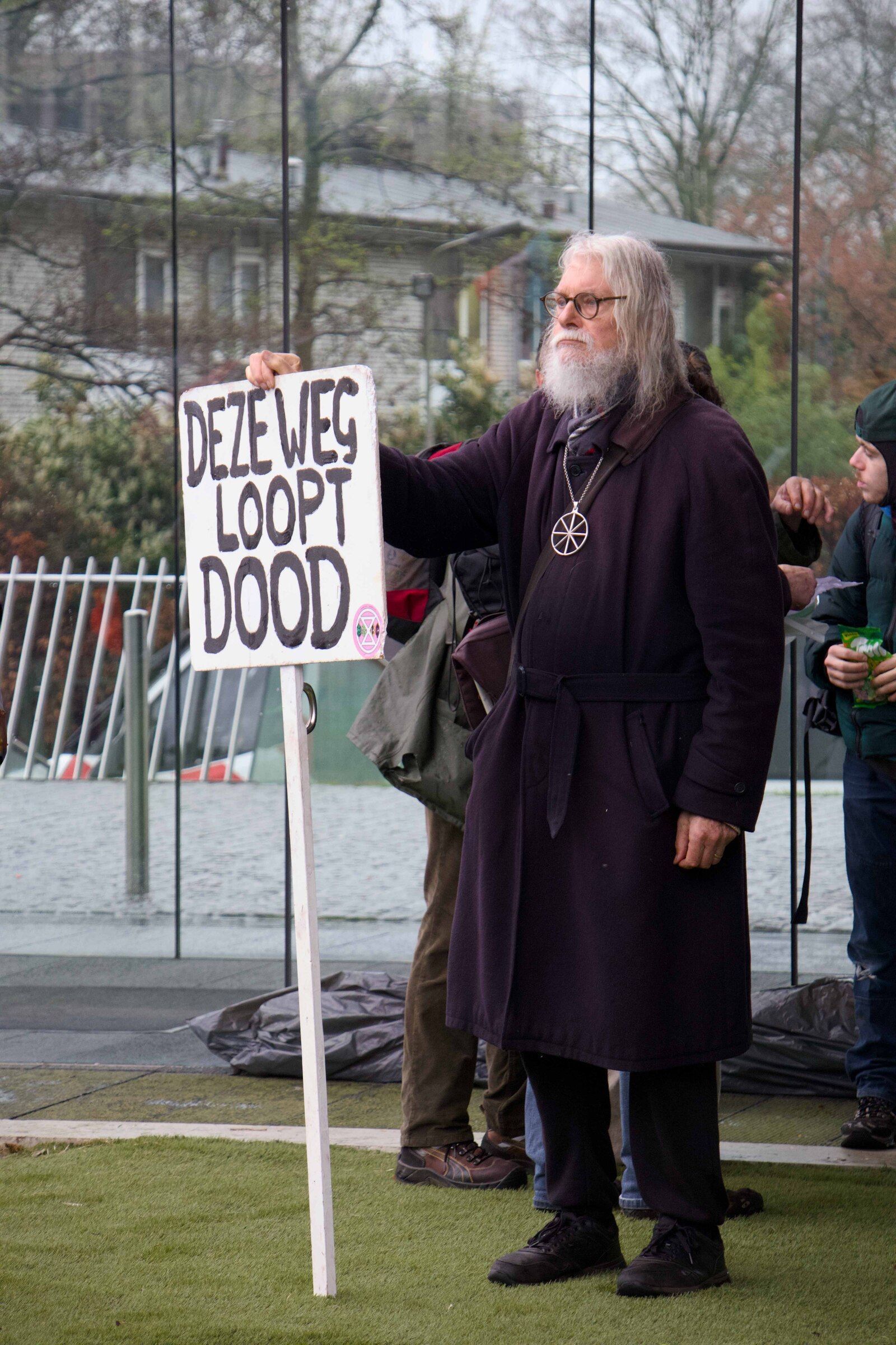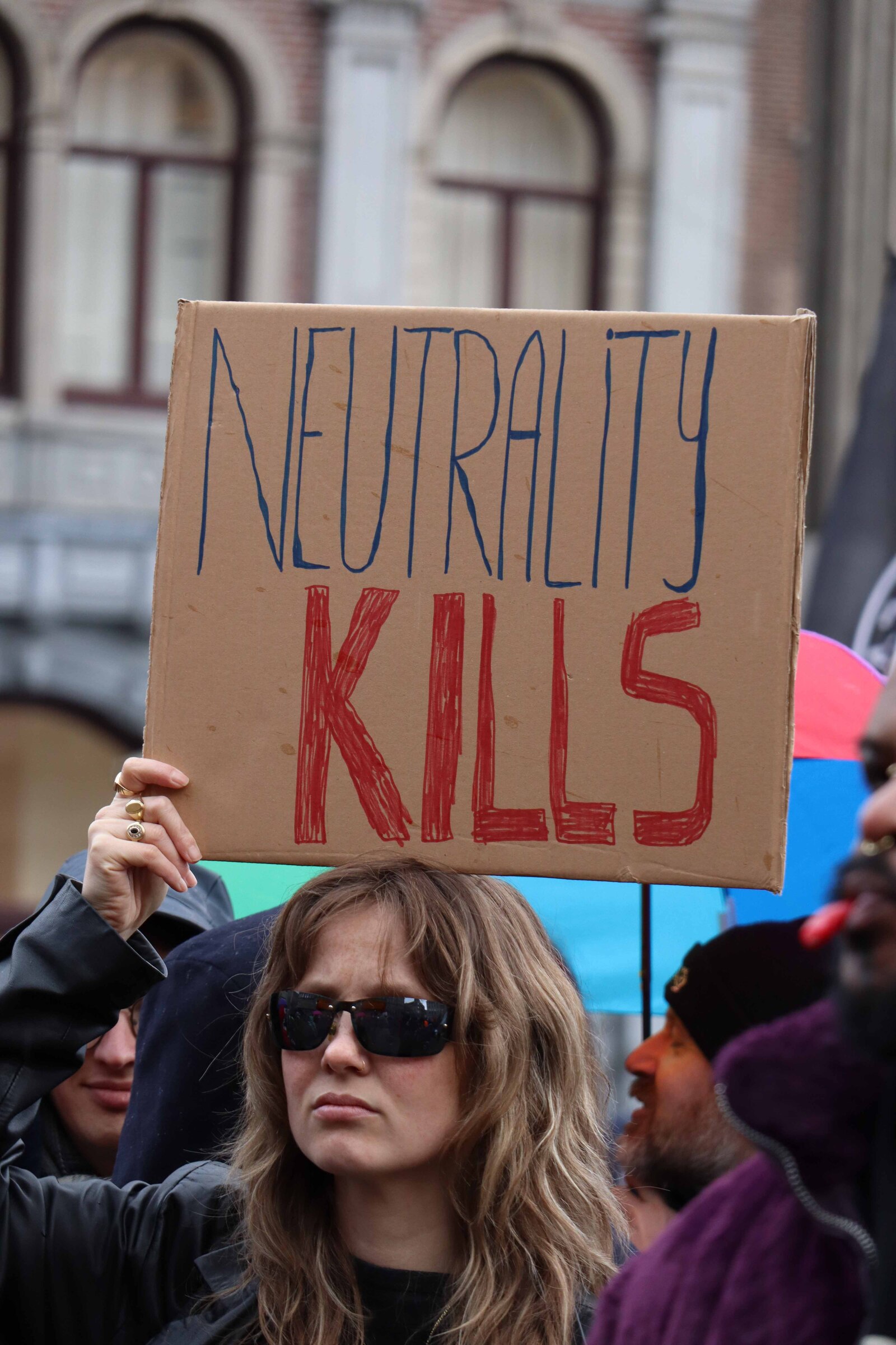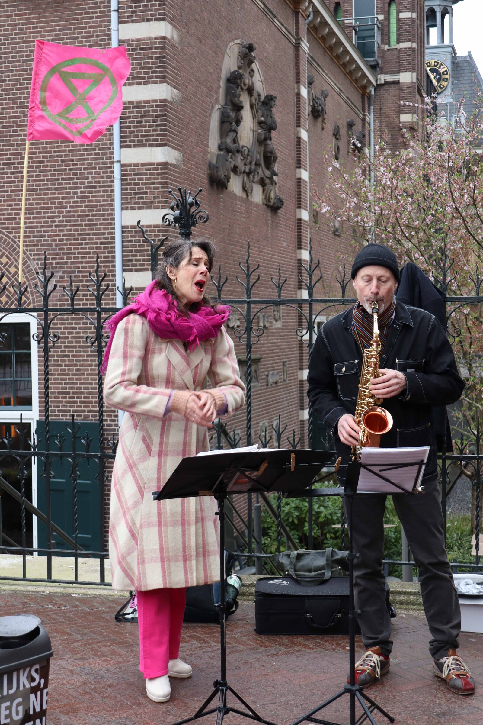 Extinction Rebellion protested in front of the Rijksmuseum against their ties with bank ING. ING is the single greatest funder of fossil fuels in the Netherlands and currently acts as the lead sponsor of the museum. During the protest, people were given the ability to share their speeches. One person shared a letter to their future child, in which they expressed how scared they are of the current climate developments and the consequences thereof. The emotions captured within this letter resonated with a lot of the listeners. In the moment captured, an activist was listening to the speech, while a tear rolled down her face.