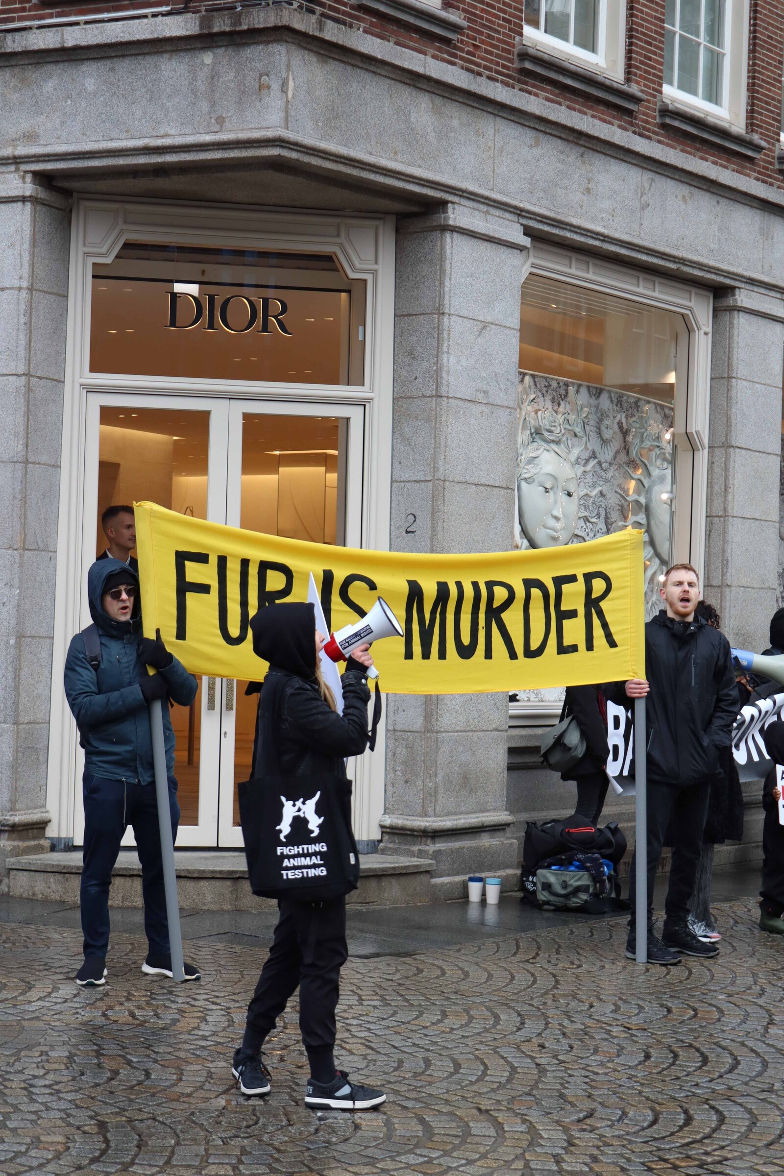 Animal Save Movement organizes Save Squares. These are actions in which vegan activists stand at a busy spot with their backs facing one another, holding screens that display videos taken in slaughterhouses, while others talk to willing passengers about where their food originates from, and whether this aligns with their morals. While eight activists were supposed to participate in this particular Save Square, only two of them showed up. However, this didn’t lessen their motivation to stand up for the animals. In the moment captured, a passerby was looking at the video, while the activist conversed with him about his observations.