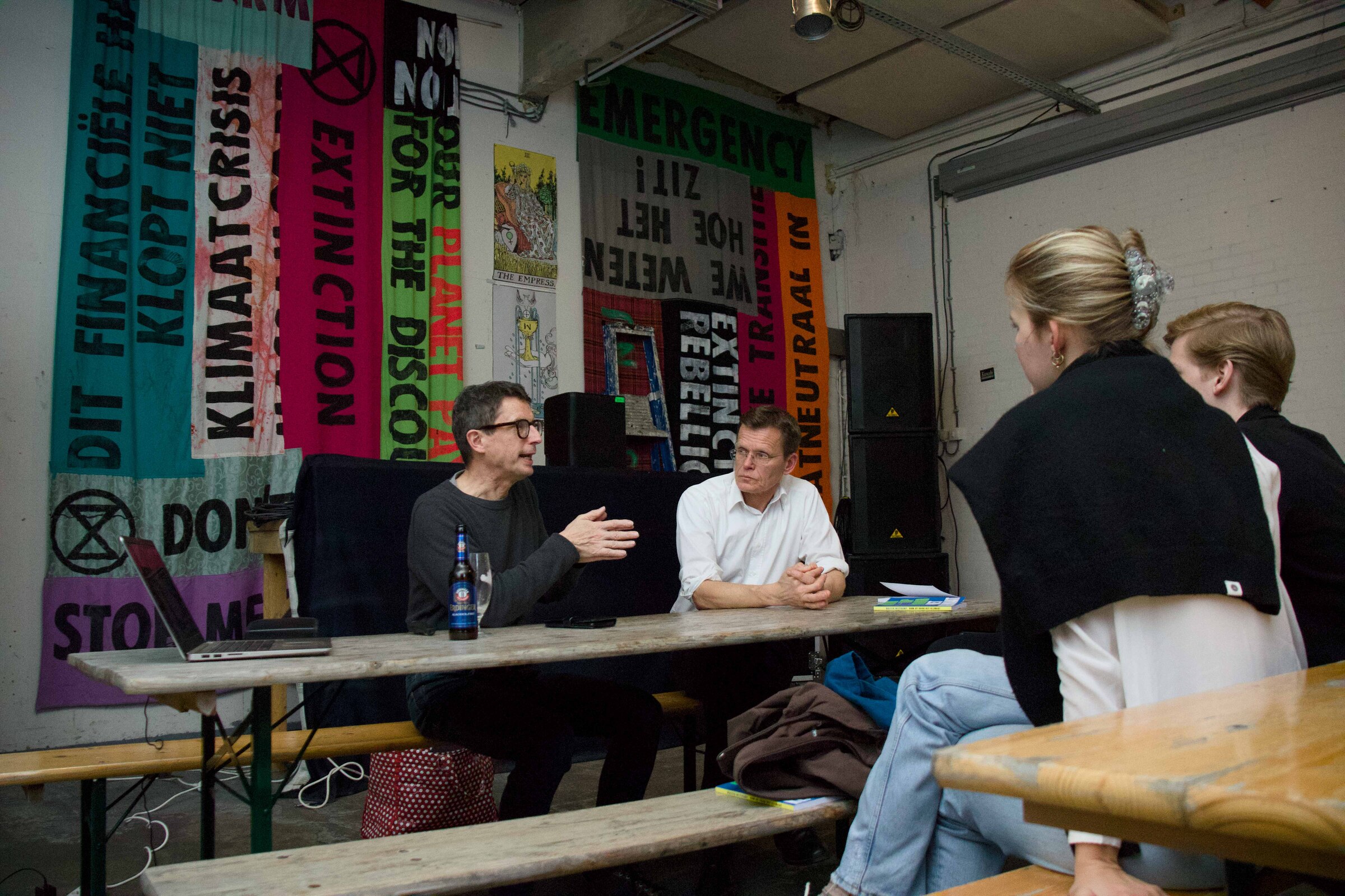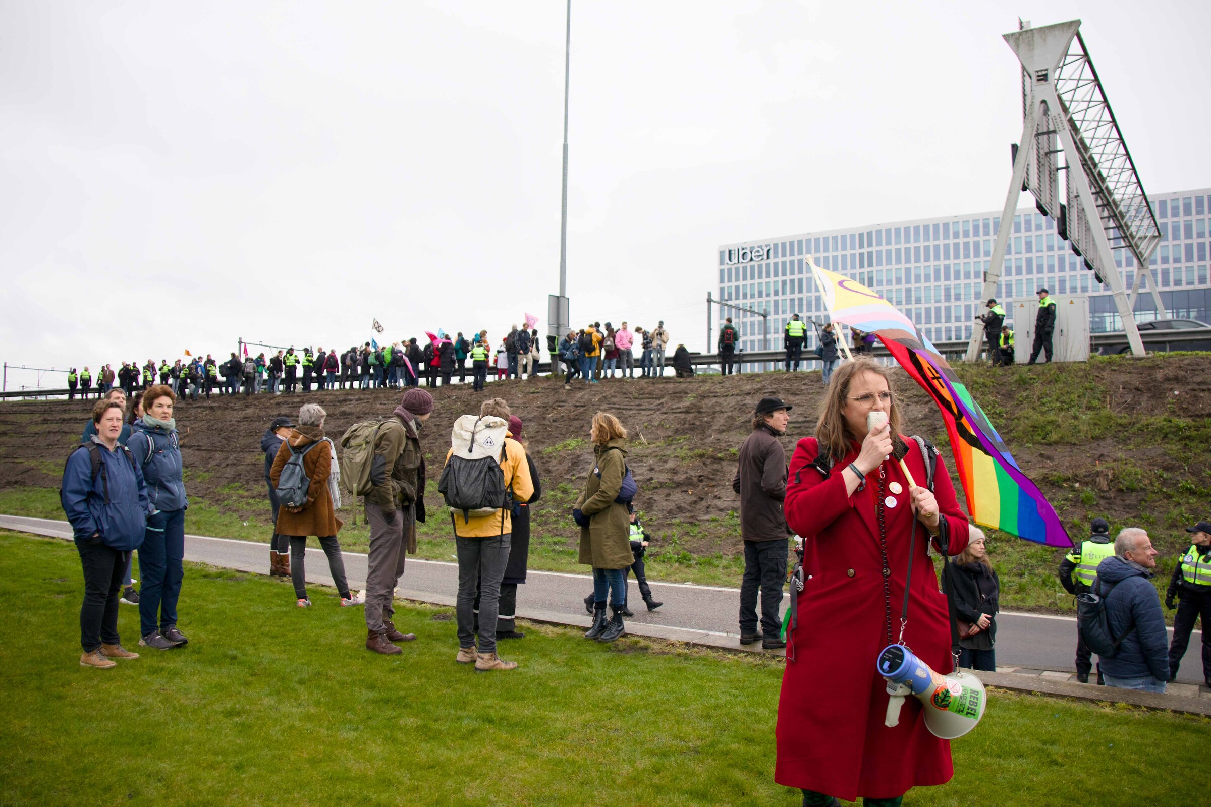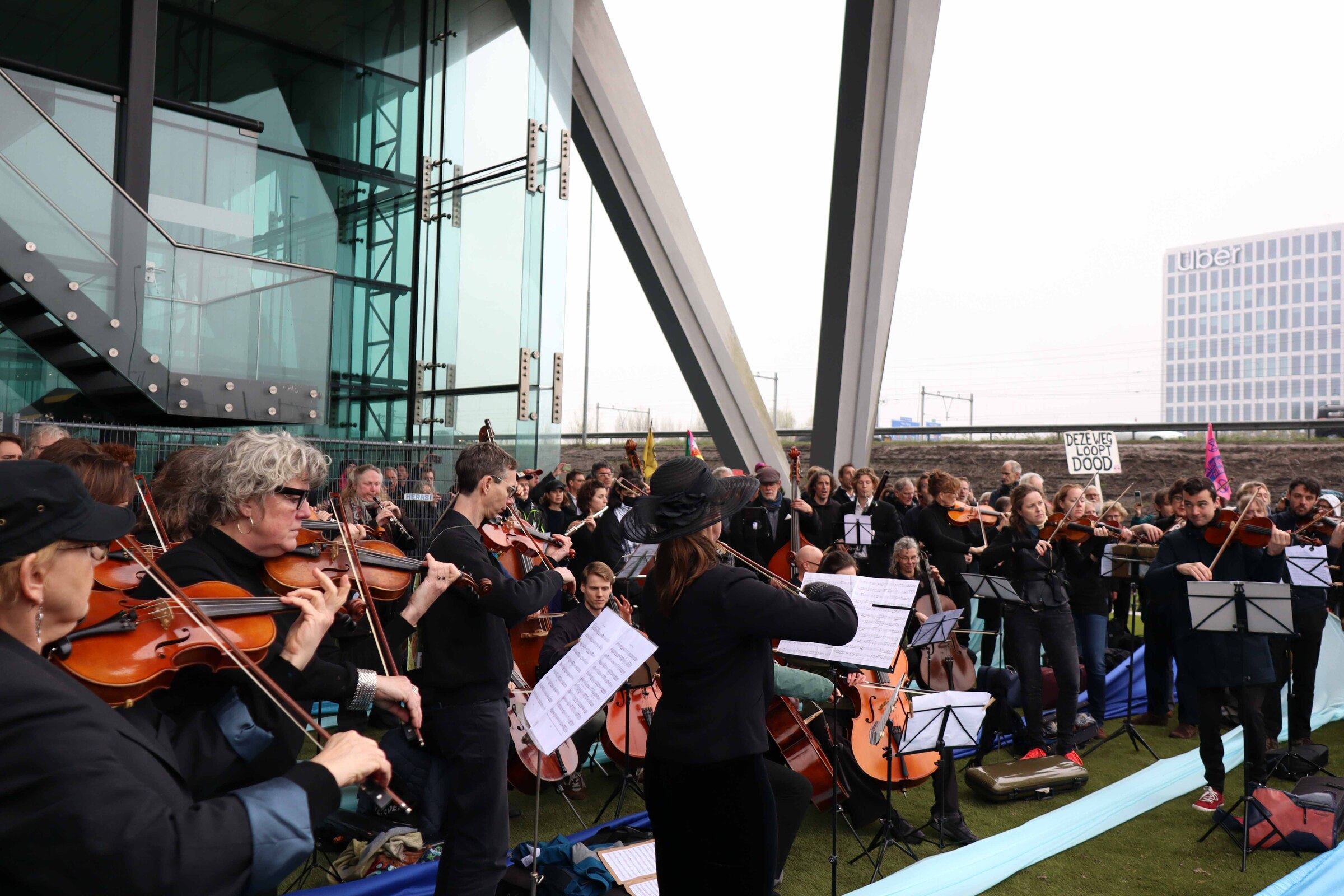In their mission to make the ING bank cut ties with the fossil fuel industry, Extinction Rebellion planned to block the A10 highway for the third time. However, this time the police prevented the blockade from happening, so the protest diverted to the location of the legal support demo. In the moment captured, an orchestra and choir of activists performed the final chorus of the Matthäus Passion. Throughout the song, blue textiles were pulled up to create the illusion that the musicians were drowning in a sea. Moments of silence followed the last note before a loud applause began.
